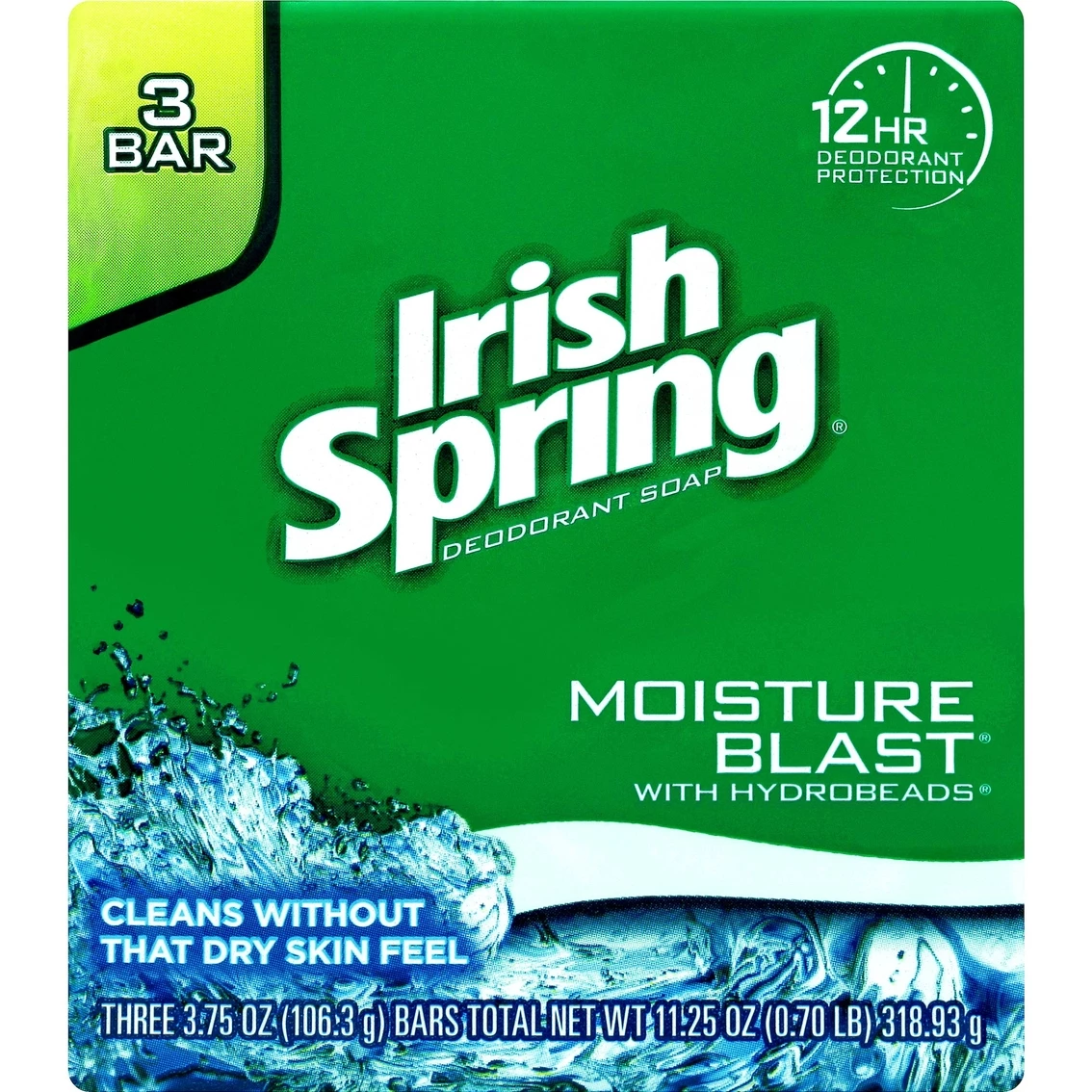 Formulated with HydroBeads particles that instantly dissolves on your skin as you shower, the Irish Spring Moisture Blast Deodorant Bath Bar cleans without that dry skin feel! 12-hour deodorant protection. Great, revitalizing scent. Helps retain your skin’s natural moisture. 3 pack. Size: 3.75 oz. each.