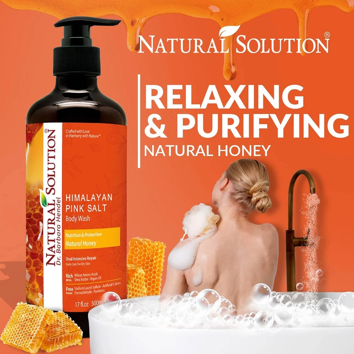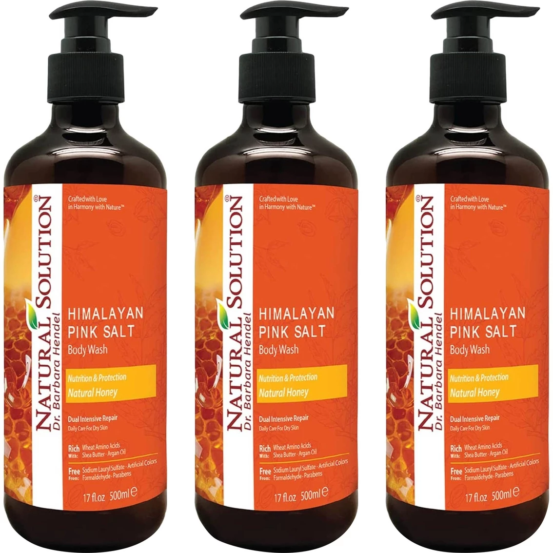 Natural Solution Himalayan Pink Salt Body Wash gently and effectively cleanses skin while leaving it feeling soothed and moisturized. Infused with Himalayan pink salt, which is rich in minerals and natural honey, this unique formula is designed to work with your skin to remove dirt and impurities without disrupting the skin’s natural moisture barrier. Rich in minerals with Himalayan pink salt, mined deep from the Himalayan Mountains, with Natural Honey, Shea Butter, and Argan Oil. Free from Sodium Lauryl Sulfate, artificial colors formaldehyde, parabens.