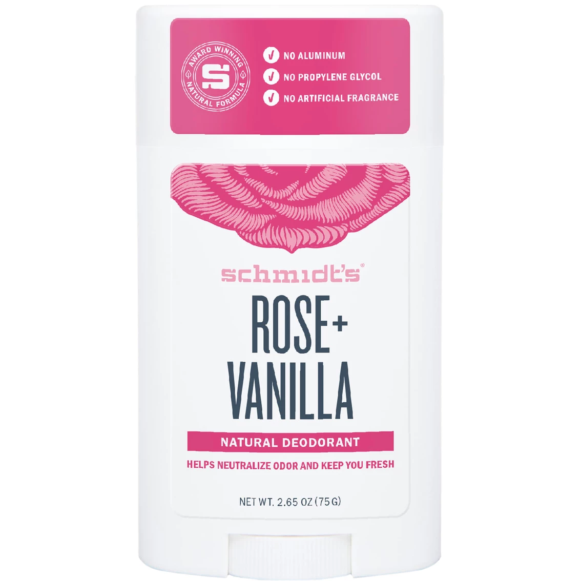 Schmidtβs natural deodorant formulas use innovative ingredients derived from plants and minerals to help effectively neutralize odor and keep you fresh. We heard that natural deodorants never work, so we made one that does. Schmidtβs Signature Stick deodorants are free of aluminum salts, propylene glycol, parabens, phthalates, and contain no artificial fragrances or coloring. Schmidt’s deodorants are made with plant-based oils and butters like coconut oil, jojoba seed oil, and shea butter, as well as vitamin E so you can smell good and feel good. Our certified vegan deodorants are also certified cruelty free. This Schmidtβs gender neutral signature deodorant has a natural fragrance of Rose and Vanilla for a luxurious and elegant scent. The scent variant is reminiscent of a fresh bouquet of roses with warming hints of sweet vanilla, keeping you smelling and feeling great. Our signature formula uses baking soda to help neutralize odor for natural and refreshing protection and the non-greasy and non-sticky feel allows the deodorant to be easily absorbed. All of our Schmidtβs natural deodorant sticks require only a small amount of application for great results. Size: 2.65 oz.